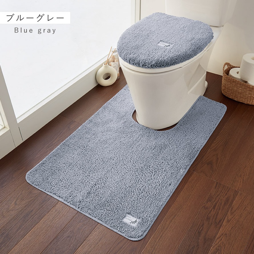 どんなトイレのインテリアにも合わせやすい無地のトイレマット&蓋カバー。右端のタグがワンポイント。