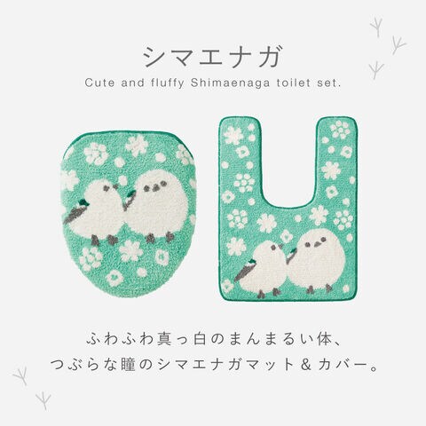 ふわふわ真っ白のまんまるい体、つぶらな瞳が愛らしいシマエナガの、ふわふわ癒されるトイレマット&蓋カバー。