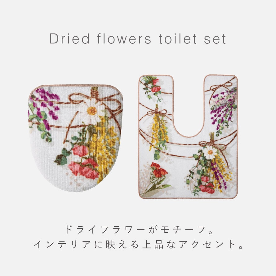 ドライフラワーが印象的な爽やかトイレマット&蓋カバー。ミモザのやさしい黄色やナチュラルな雰囲気が、ナチュラルテイストや北欧風、フラワーモチーフを好む人に人気があります。トイレ空間も「インテリアの一部」として、素敵な空間を演出してみませんか?