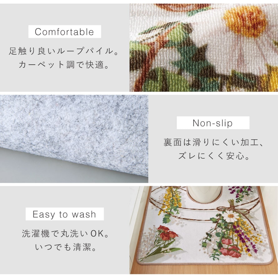 トイレマットは、サラッとした足触りのループパイル仕様。カーペット調で快適な踏み心地です。