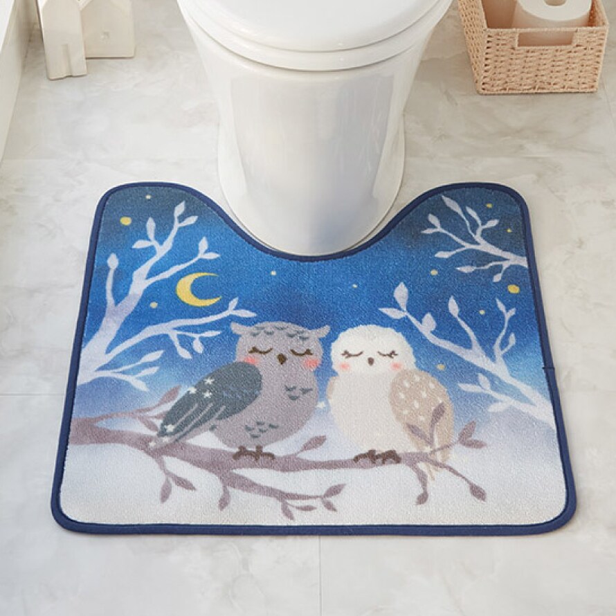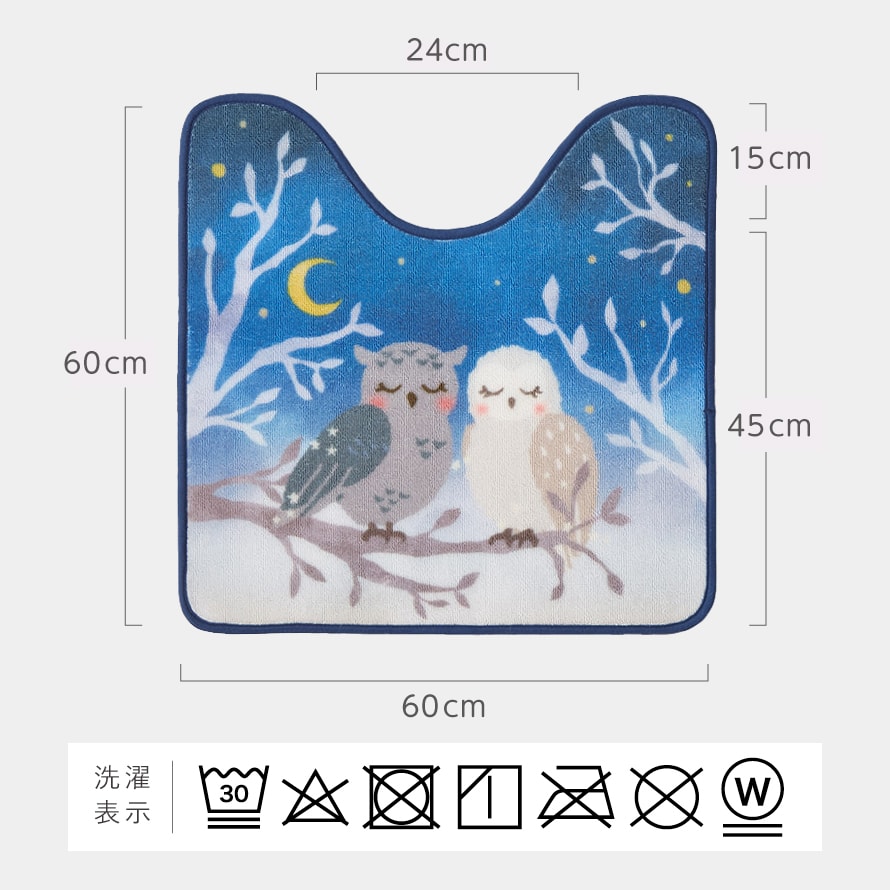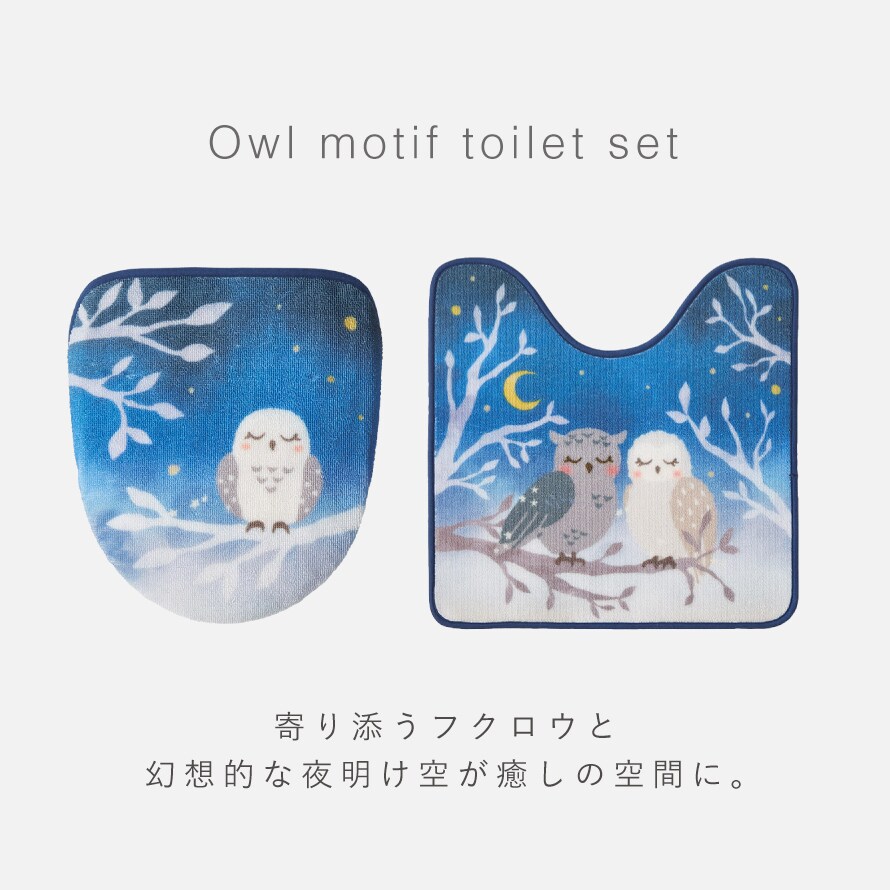 愛らしく縁起の良いフクロウモチーフ。夜明けの空をイメージした深いブルーのグラデーションは、幻想的で落ち着いた雰囲気。トイレマットと蓋カバーをコーディネイトで日常のトイレ空間を、癒しのひとときに。