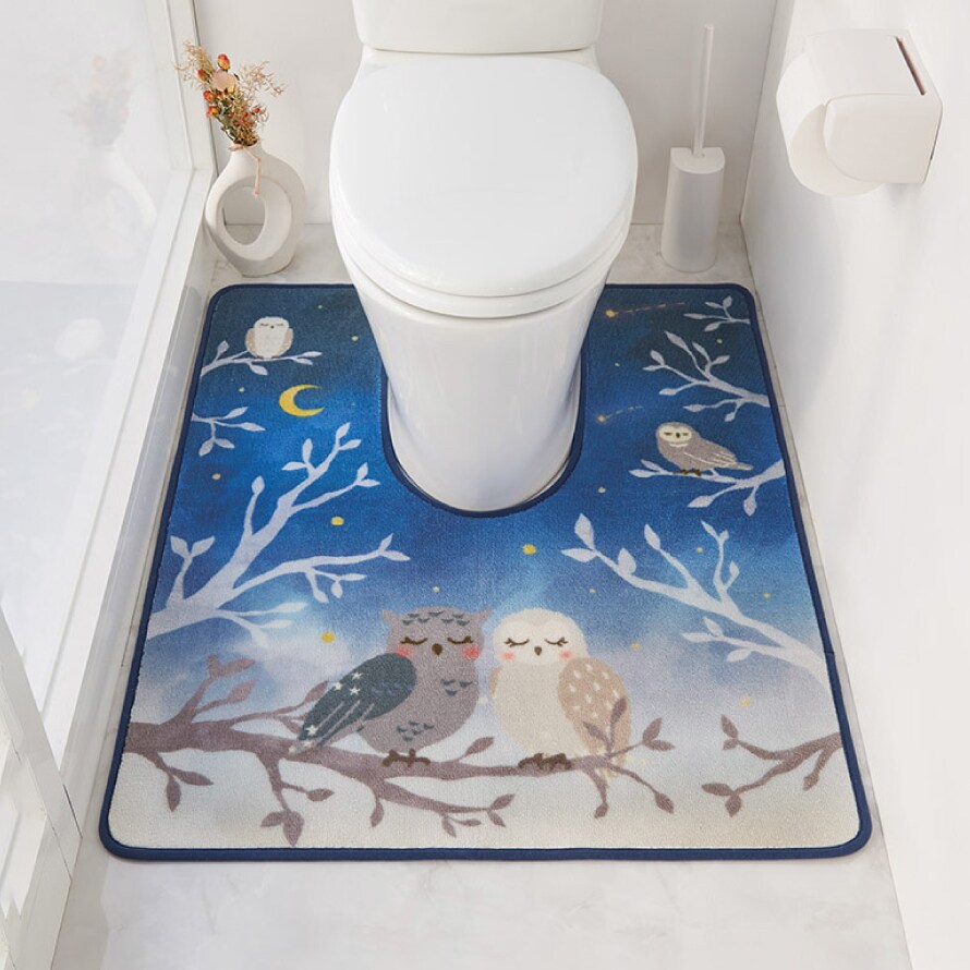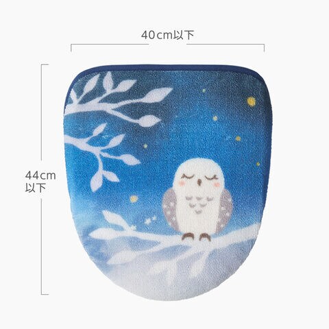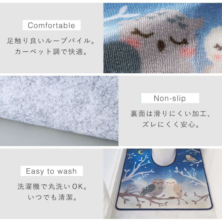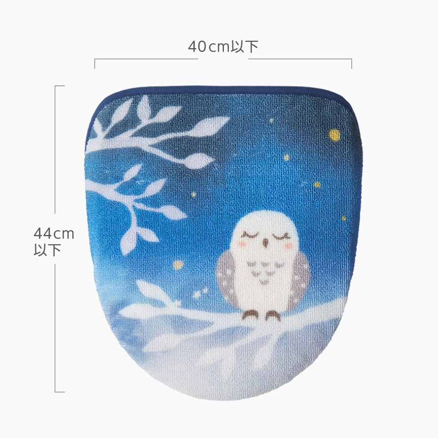 愛らしく縁起の良いフクロウモチーフ。夜明けの空をイメージした深いブルーのグラデーションは、幻想的で落ち着いた雰囲気。トイレマットと蓋カバーをコーディネイトで日常のトイレ空間を、癒しのひとときに。