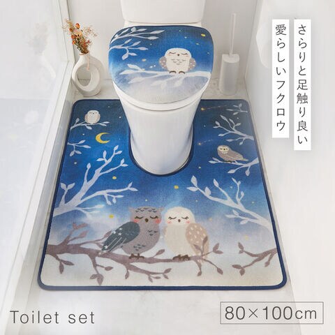 トイレマット フタカバーセット 80×100cm フクロウ ブルー 耳長 ワイド トイレ 蓋 カバー 2点セット 洗える すべり止め 滑り止め トイレ インテリア おしゃれ ジャンボ耳長トイレマット・フタカバーセット 夜明け