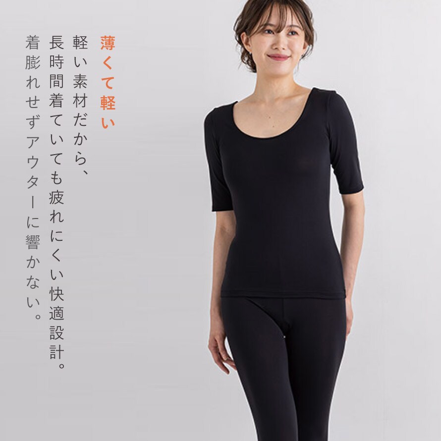 深あき インナー レディース 【上下セット】5分袖 10分丈レギンス 裏起毛 シャツ 吸汗速乾 あったかインナー 冬 暖かい 防寒 薄手 軽い 動きやすい 襟ぐり広め 襟ぐり深め ふわぬく裏起毛インナー上下セット 5分袖