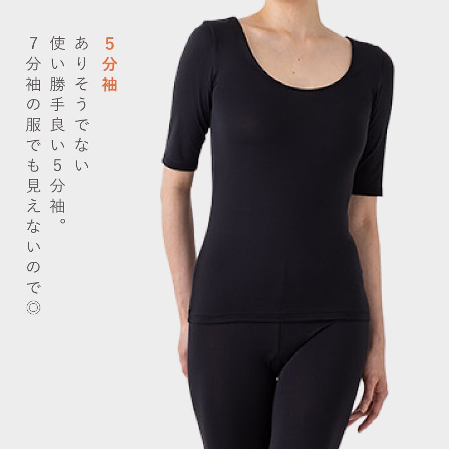 トップスは、広めの襟ぐりでインナーのチラ見えを防止。暖かさをキープしながらおしゃれも楽しめる理想のあき具合。秋の肌寒い日から冬まで、ロングシーズン活躍する5分袖。カーディガンや七分袖トップスのインナーにも◎。袖口がアウターに響きにくく、すっきりとした着こなしに。
