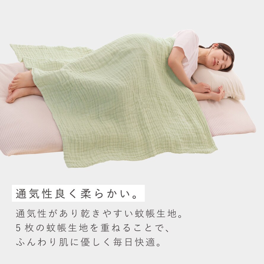 蚊帳生地を贅沢に5枚重ねた贅沢な素材感。蚊帳織り特有の空気を通す構造で、蒸れずにさらっと快適に過ごせます。「冷えすぎるエアコンが苦手…」という方にもおすすめの一枚です。