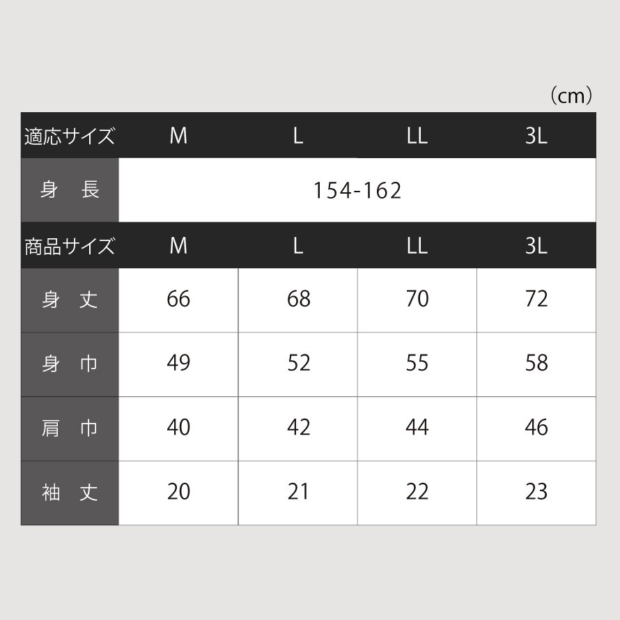 サイズ身長154-162、M/バスト79-87、身丈66、身幅49、肩幅40、袖丈20、L/バスト86-94、身丈68、身幅52、肩幅42、袖丈21、LL/バスト93-101、身丈70、身幅55、肩幅44、袖丈22、3L/バスト100-108、身丈72、身幅58、肩幅46、袖丈23cm