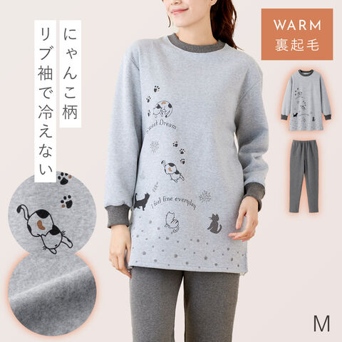 パジャマ 裏起毛 猫柄 レディース 上下セット M L LL 寝巻 ルームウェア 冬 暖かい リブ袖 あったか裏起毛にゃんこパジャマ 長袖 ふんわり ふわふわ 50代 60代 70代