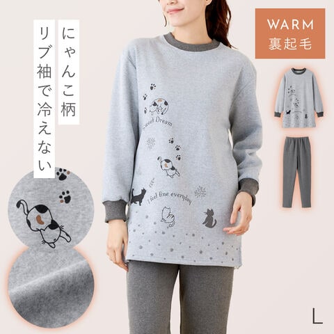 パジャマ 裏起毛 猫柄 レディース 上下セット M L LL 寝巻 ルームウェア 冬 暖かい リブ袖 あったか裏起毛にゃんこパジャマ 長袖 ふんわり ふわふわ 50代 60代 70代