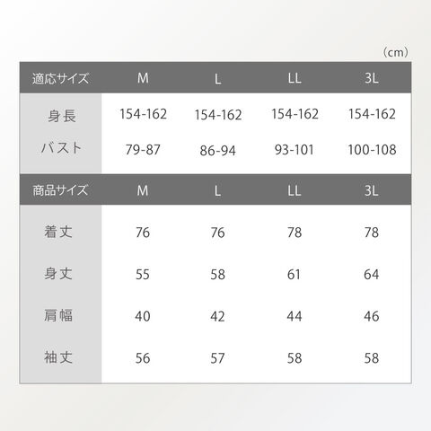 | サイズ | 身長154-162、M/バスト79-87、着丈76、身幅55、肩幅40、袖丈56、L/バスト86-94、着丈76、身幅58、肩幅42、袖丈57、LL/バスト93-101、着丈78、身幅61、肩幅44、袖丈58、3L/バスト100-108、着丈78、身幅64、肩幅46、袖丈58cm |