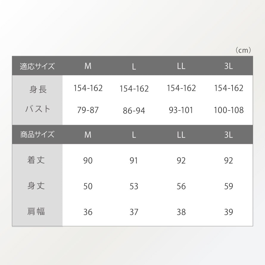 | サイズ | 身長154-162、M/バスト79-87、着丈90、身丈50、肩幅36、L/バスト86-94、着丈91、身丈53、肩幅37、LL/バスト93-101、着丈92、身丈56、肩幅38、3L/バスト100-108、着丈92、身丈59、肩幅39cm |