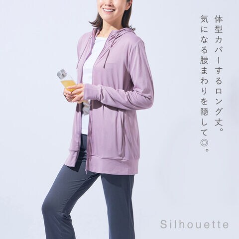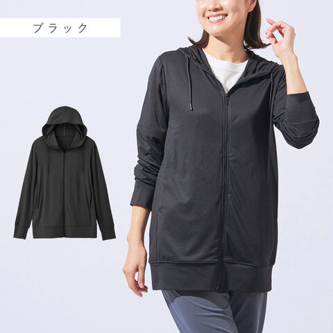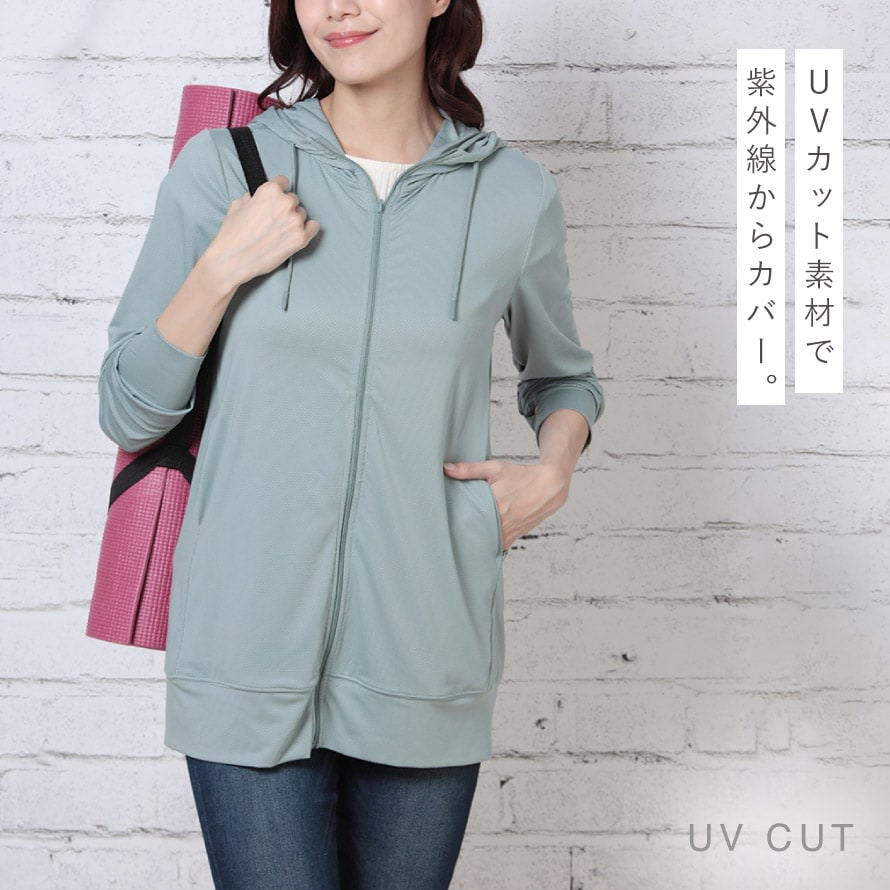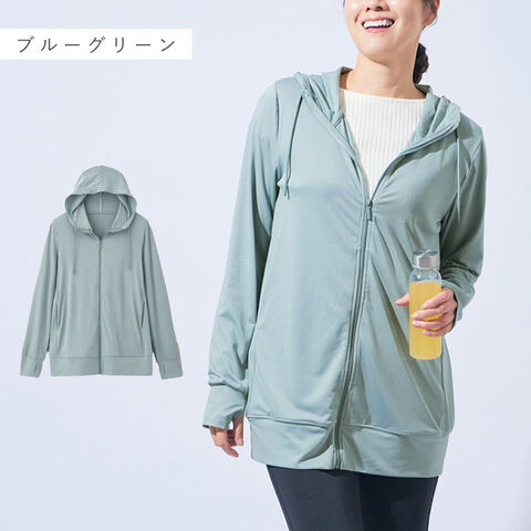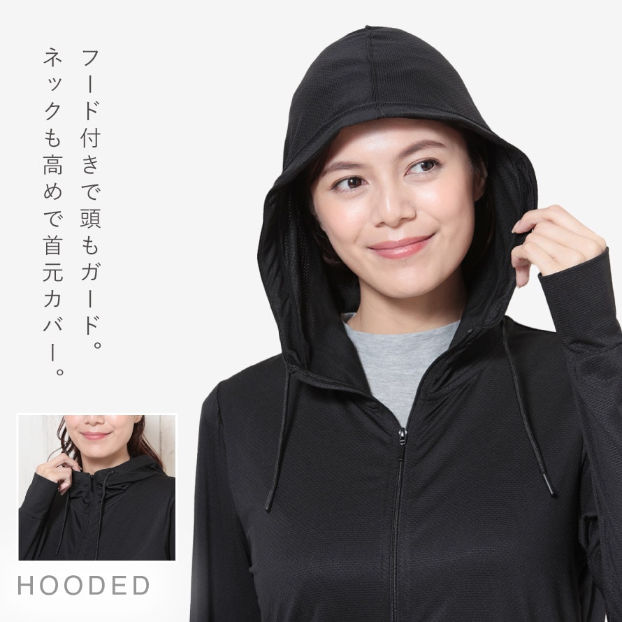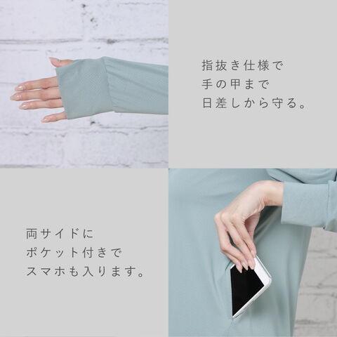 フード付きなので頭もガード。衿高なのでフードをおろしても首元までカバーします。ゆったり広めの袖ぐりで服がひびきにくいところも◎。指抜き仕様で手の甲まで日差しから守ります。