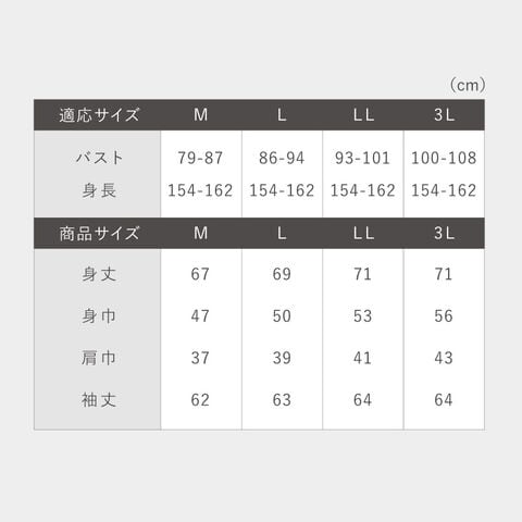 | サイズ | M/バスト79-87、身丈67、身幅47、肩幅37、袖丈62、L/バスト86-94、身丈69、身幅50、肩幅39、袖丈63、LL/バスト93-101、身丈71、身幅53、肩幅41、袖丈64、3L/バスト100-108、身丈71、身幅56、肩幅43、袖丈64cm |