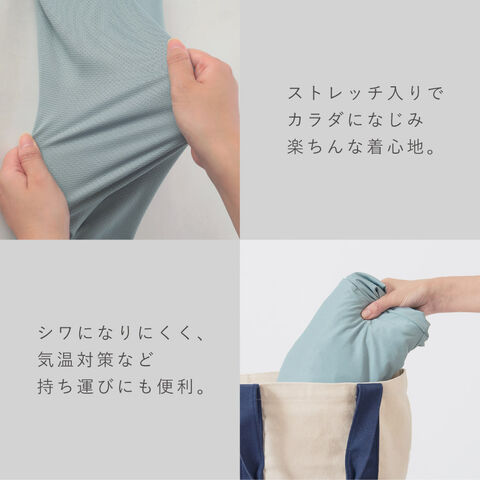凹凸ある素材でサラッとした肌触り。ストレッチ入りでカラダにほどよくなじみ、楽ちんな着心地です。シワになりにくく、日焼け対策や気温対策など、一枚あると重宝します。持ち運びにも便利。