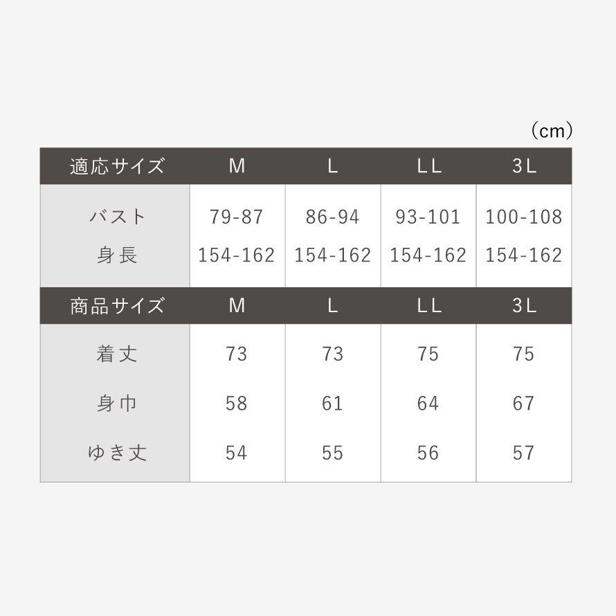 サイズM/バスト79-87、着丈73、身幅58、ゆき丈54、L/バスト86-94、着丈73、身幅61、ゆき丈55、LL/バスト93-101、着丈75、身幅64、ゆき丈56、3L/バスト100-108、着丈75、身幅67、ゆき丈57cm