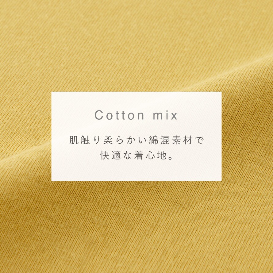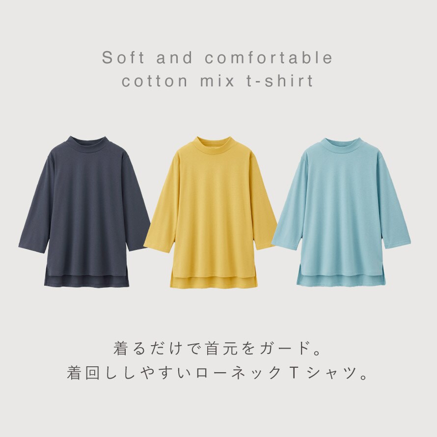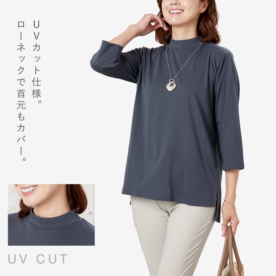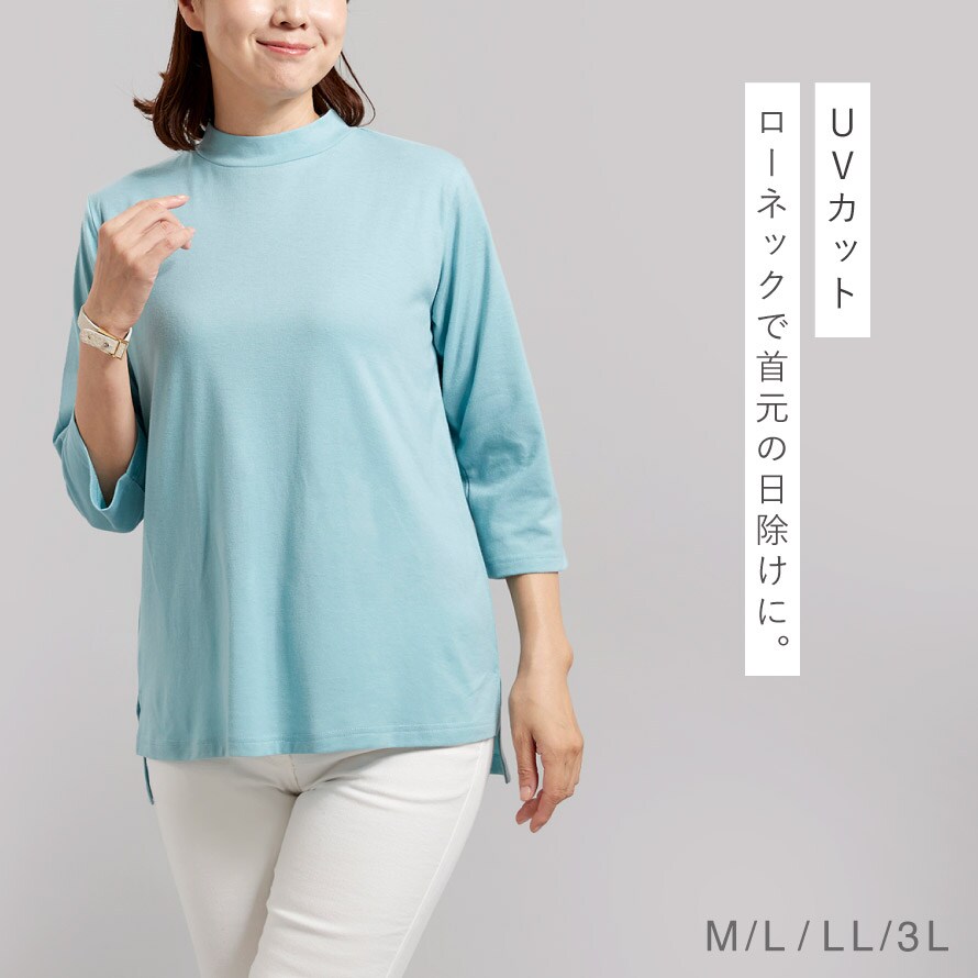 柔らかで着心地の良い綿混素材。UVカット仕様なので日差し対策としても◎。ローネックで首元の日除けにも◎。