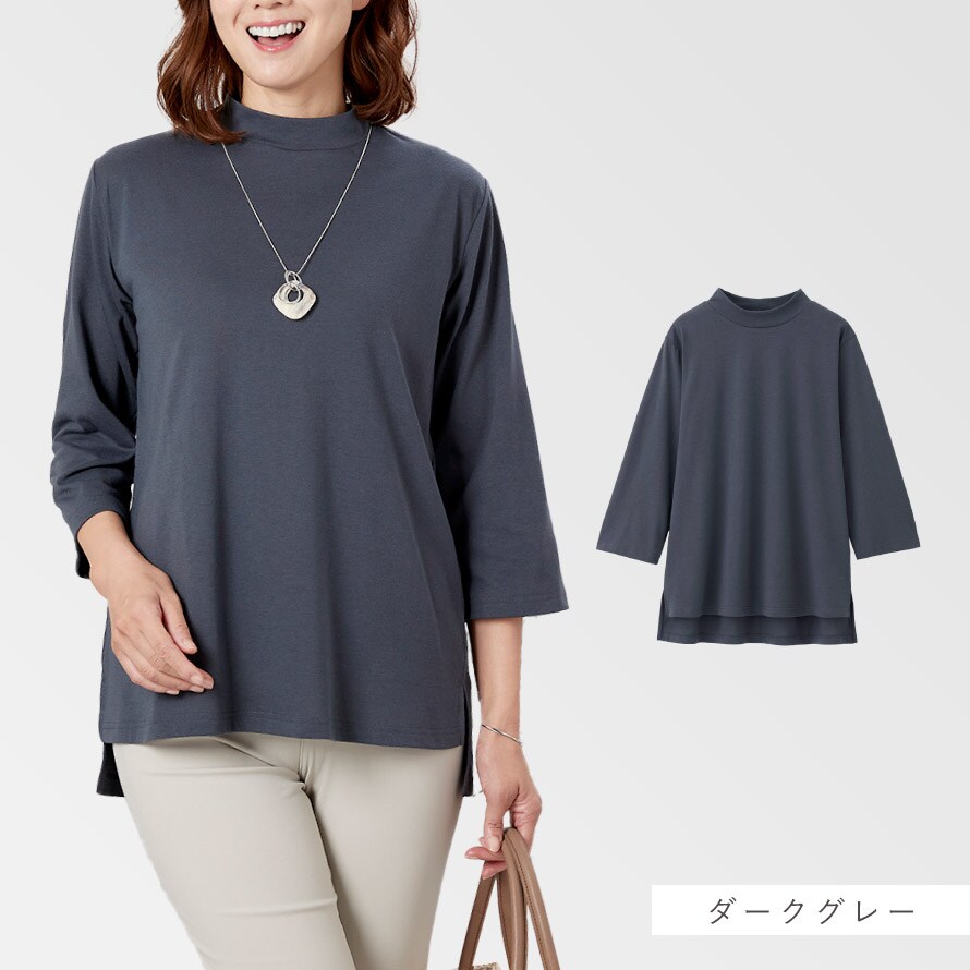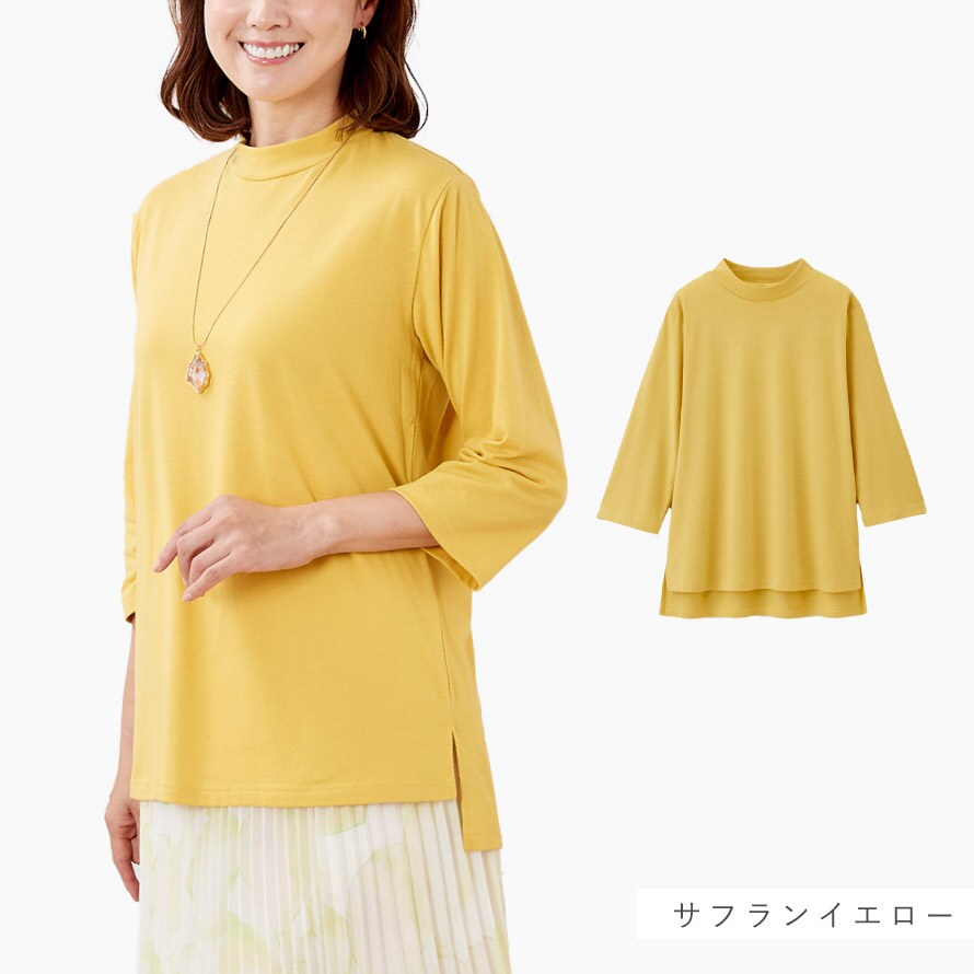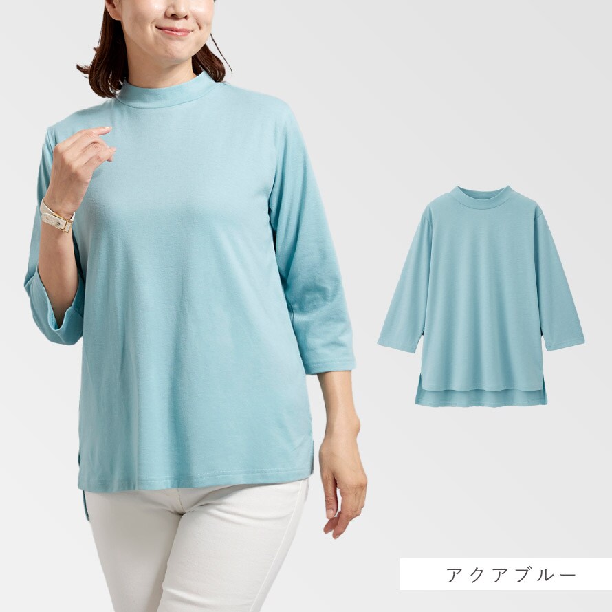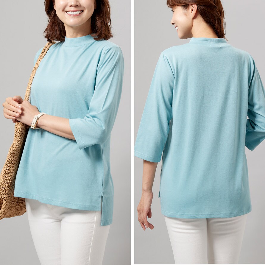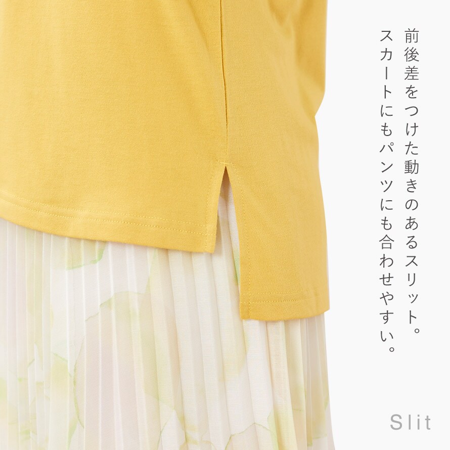 柔らかで着心地の良い綿混素材。UVカット仕様なので日差し対策としても◎。ローネックで首元の日除けにも◎。