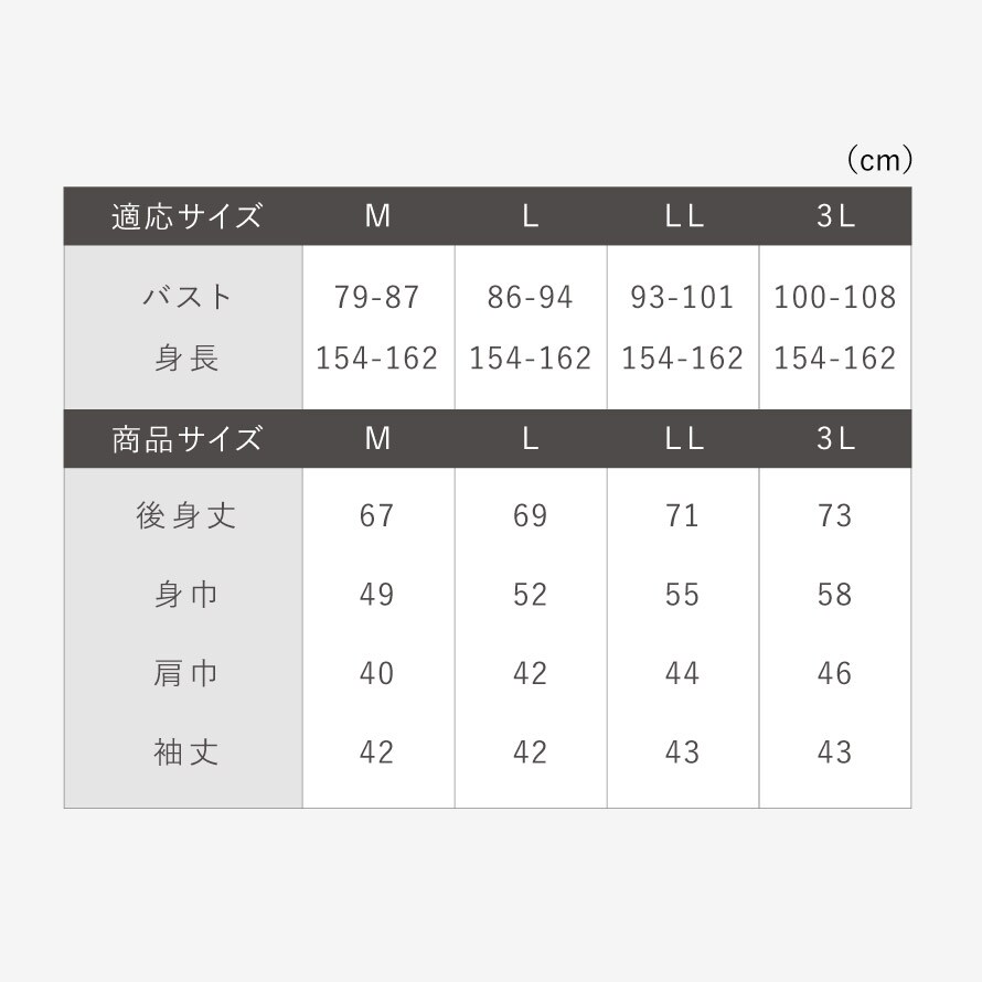 | サイズ | M/バスト79-87、後身丈67、身幅49、肩幅40、袖丈42、L/バスト86-94、後身丈69、身幅52、肩幅42、袖丈42、LL/バスト93-101、後身丈71、身幅55、肩幅44、袖丈43、3L/バスト100-108、後身丈73、身幅58、肩幅46、袖丈43cm |