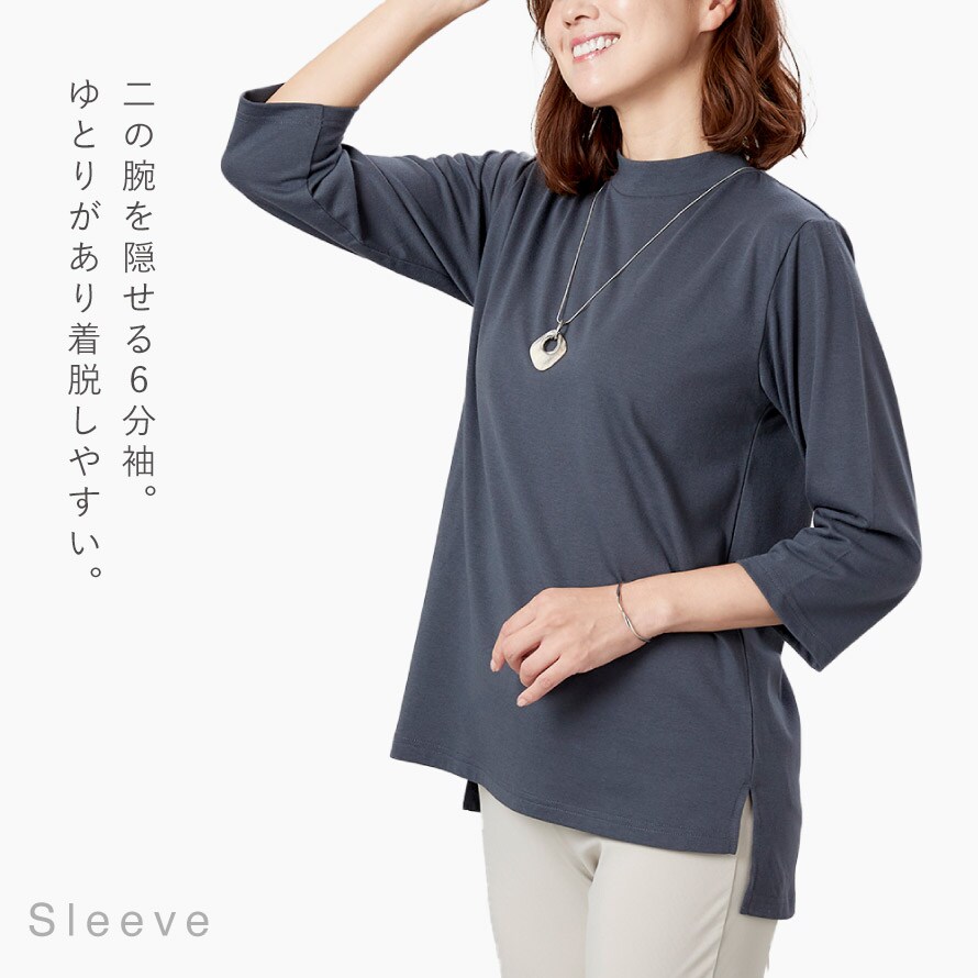 二の腕を隠して手の細い部分を見せる6分袖。ゆとりがあるので着脱しやすい。