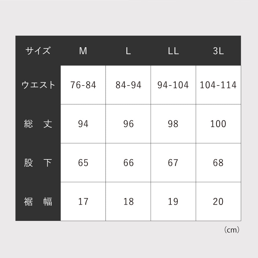 | サイズ | M/ウエスト76-84、総丈94、股下65、裾幅17、L/ウエスト84-94、総丈96、股下66、裾幅18、LL/ウエスト94-104、総丈98、股下67、裾幅19、3L/ウエスト104-114、総丈100、股下68、裾幅20cm |