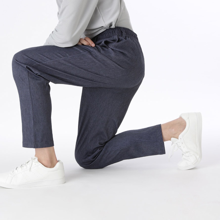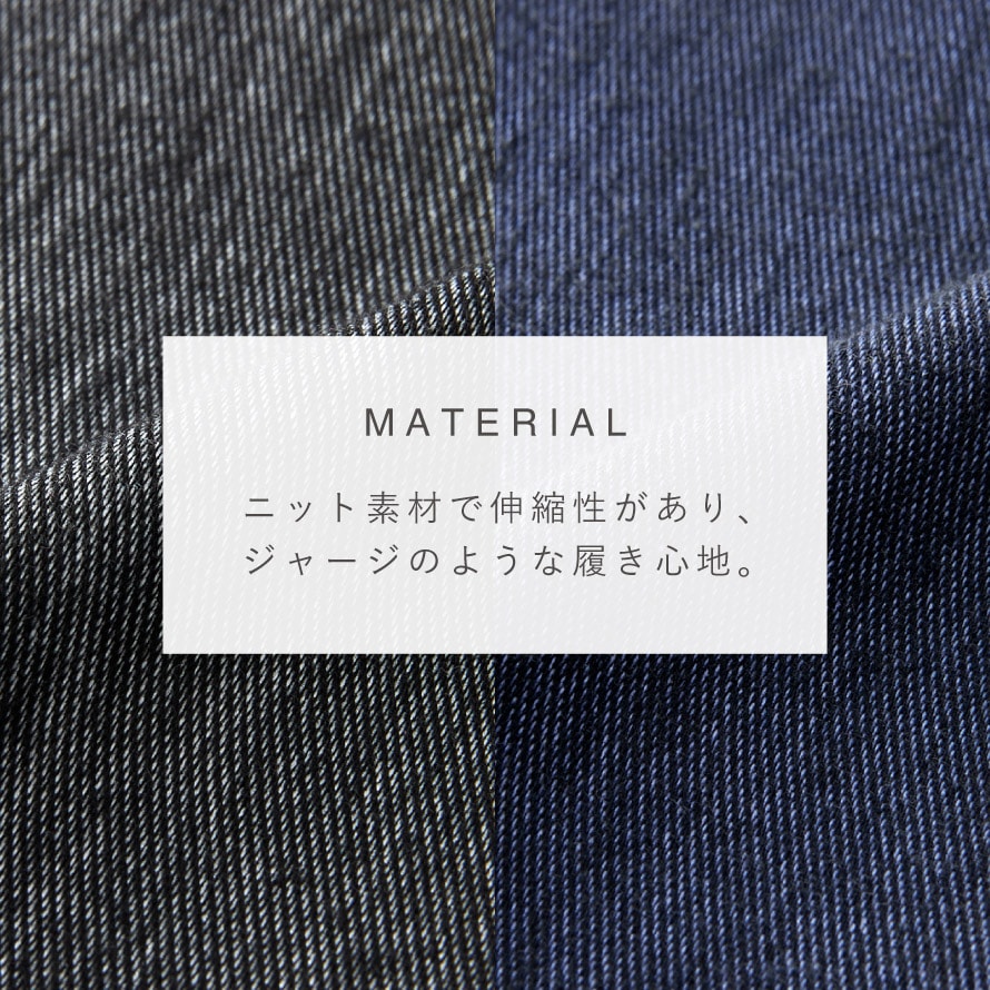 ニット素材で伸縮性があり、ジャージのような楽ちんな履き心地。デニム調なのでお出かけにも◎。お家でのくつろぎタイムにもおすすめ。
