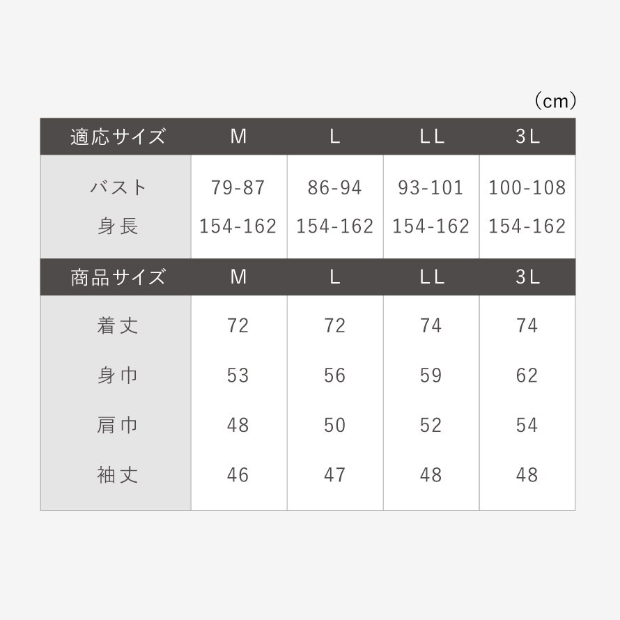 | サイズ | M/バスト79-87、着丈72、身幅53、肩幅48、袖丈46、L/バスト86-94、着丈72、身幅56、肩幅50、袖丈47、LL/バスト93-101、着丈74、身幅59、肩幅52、袖丈48、3L/バスト100-108、着丈74、身幅62、肩幅54、袖丈48cm |