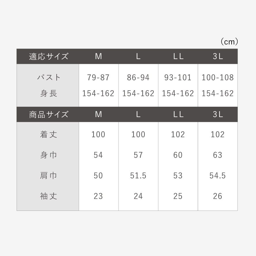 | サイズ | M/バスト79-87、着丈100、身幅54、肩幅50、袖丈23、L/バスト86-94、着丈100、身幅57、肩幅51.5、袖丈24、LL/バスト93-101、着丈102、身幅60、肩幅53、袖丈25、3L/バスト100-108、着丈102、身幅63、肩幅54.5、袖丈26cm |