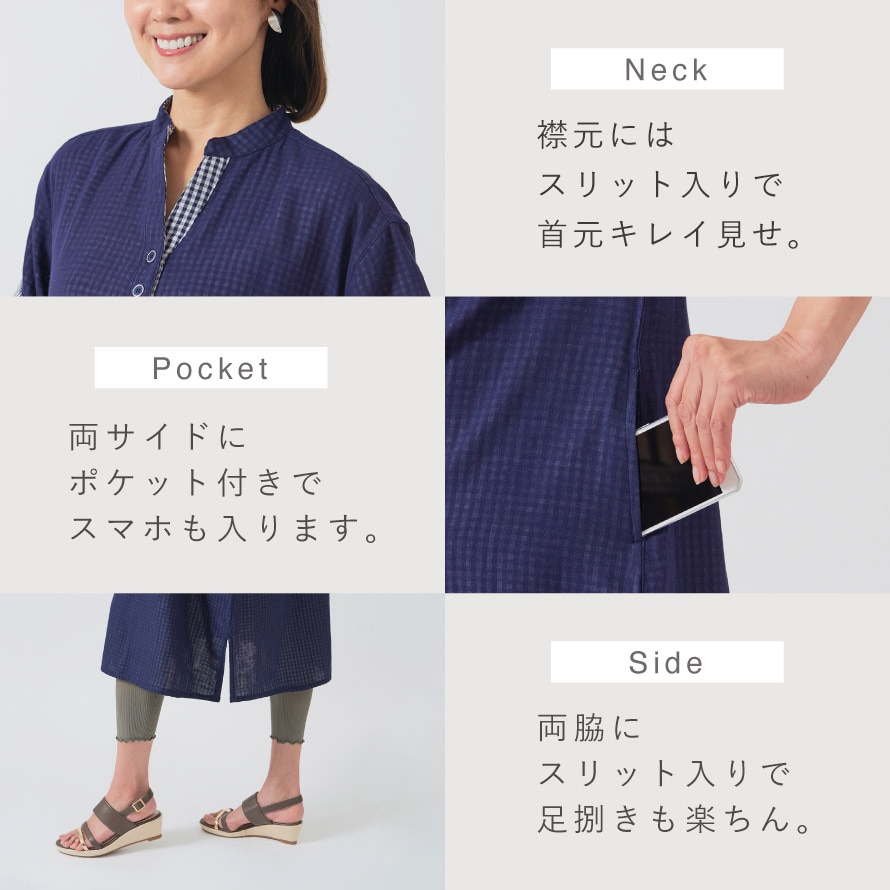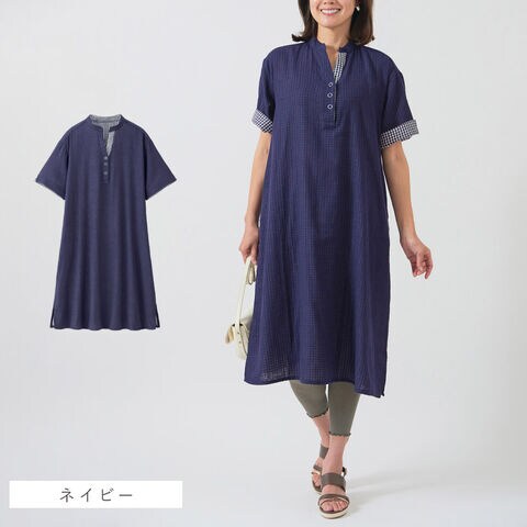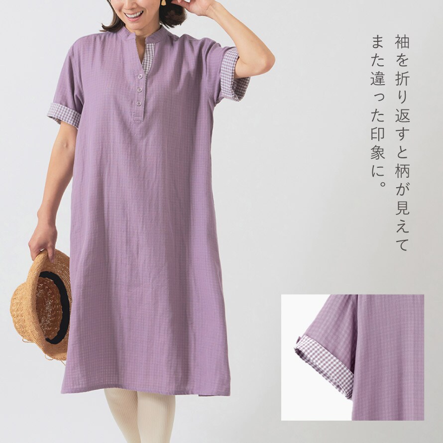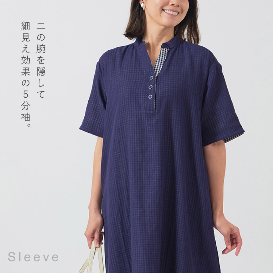 気になる二の腕をカバーする5分袖。袖を折り返すとギンガムチェック柄が見えるので、また違った印象に。