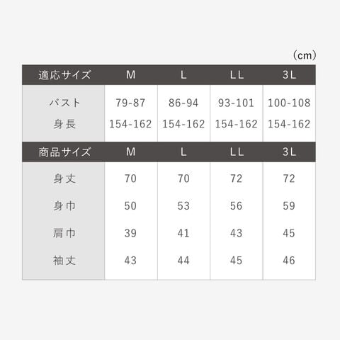 | サイズ | M/バスト79-87、身丈70、身幅50、肩幅39、袖丈43、L/バスト86-94、身丈70、身幅53、肩幅41、袖丈44、LL/バスト93-101、身丈72、身幅56、肩幅43、袖丈45、3L/バスト100-108、身丈72、身幅59、肩幅45、袖丈46cm |