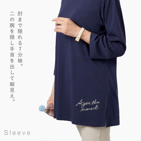 肘まで隠れる7分袖。二の腕をしっかり隠しつつ、手首周りをスッキリ見せるデザイン。気になる部分をカバーしながら軽やかな印象に。