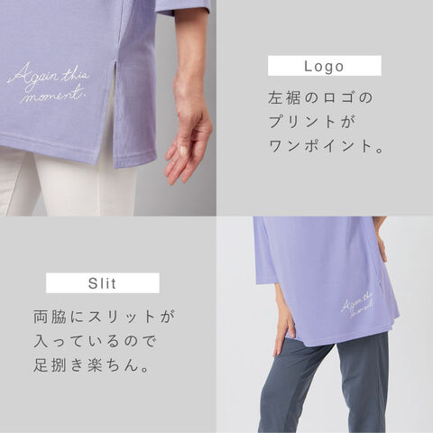 シンプルな無地カラーなのでボトムスを選ばずコーデしやすいデザイン。左裾のスリットとワンポイントのプリントが◎。