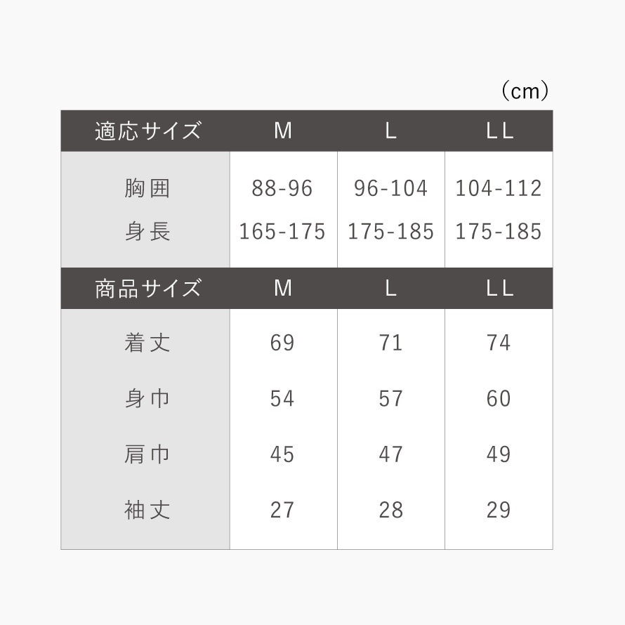 | サイズ | M/身長165-175、胸囲88-96、身丈69、身幅54、肩幅45、袖丈27、L/身長175-185、胸囲96-104、身丈71、身幅57、肩幅47、袖丈28、LL/身長175-185、胸囲104-112、身丈74、身幅60、肩幅49、袖丈29cm |
