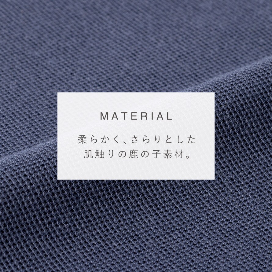柔らかく、さらりとした肌触りの鹿の子素材。吸水速乾の仕様なので暑い季節でも快適な着心地。
