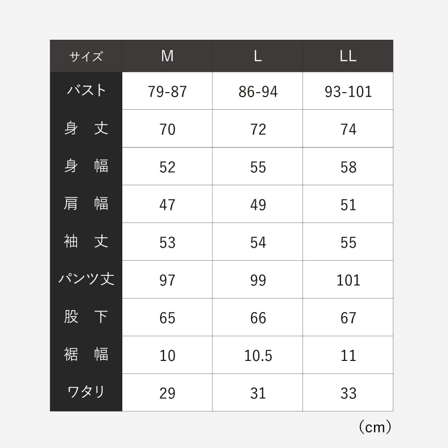 | サイズ | M/バスト79-87、身丈70、身幅52、肩幅47、袖丈53、パンツ丈97、股下65、裾幅10、ワタリ29、L/バスト86-94、身丈72、身幅55、肩幅49、袖丈54、パンツ丈99、股下66、裾幅10.5、ワタリ31、LL/バスト93-101、身丈74、身幅58、肩幅51、袖丈55、パンツ丈101、股下67、裾幅11、ワタリ33cm |