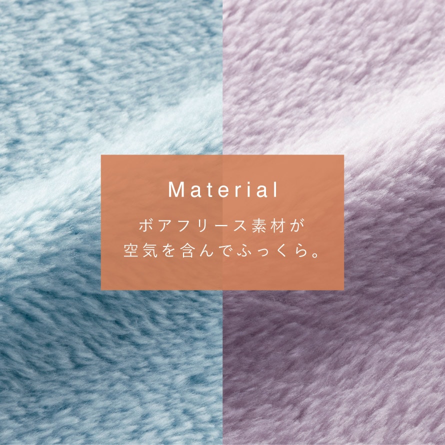 表も裏も起毛したボアフリース素材が、空気を含んでふっくら。まるで毛布に包まれているようなぬくもりで、冷え込む夜もふんわりぽかぽか。