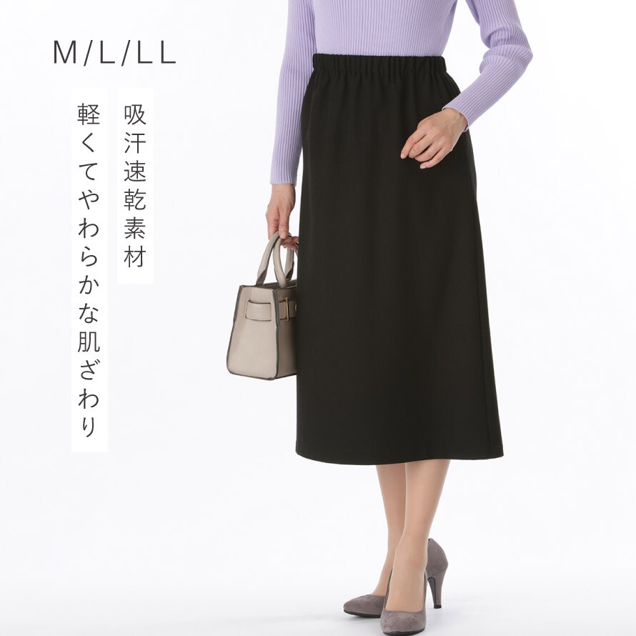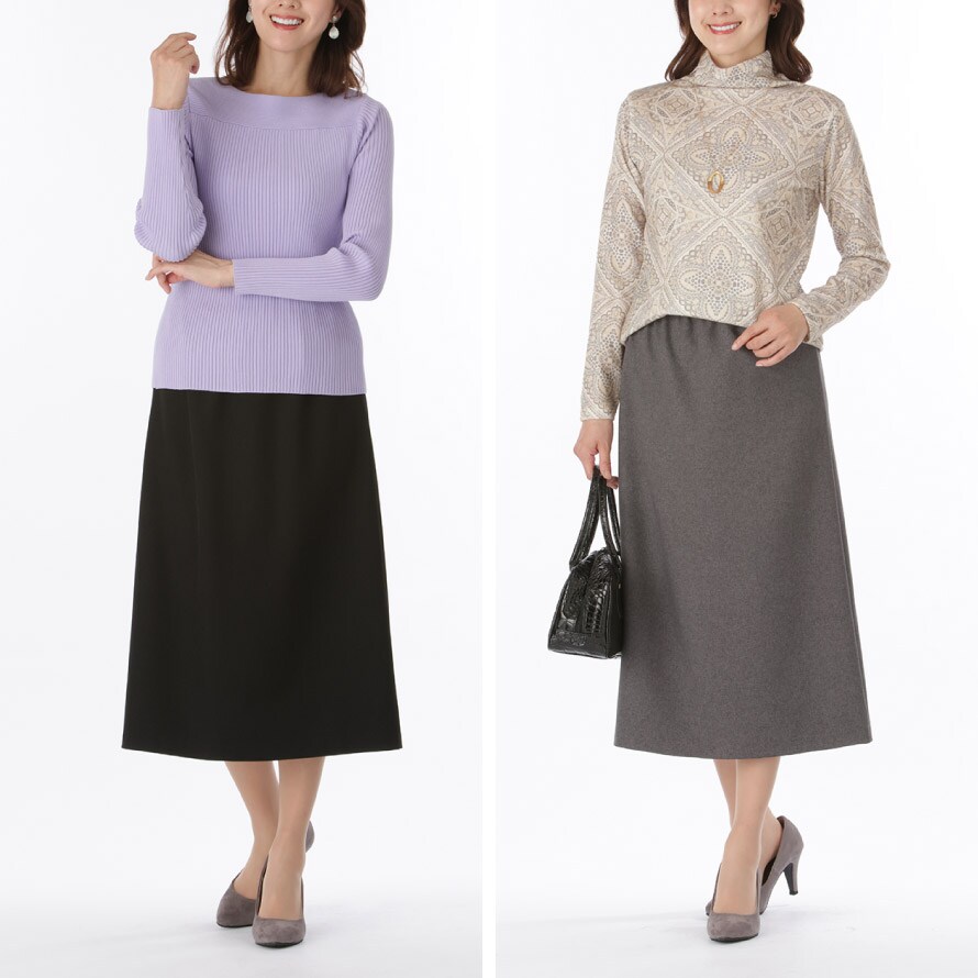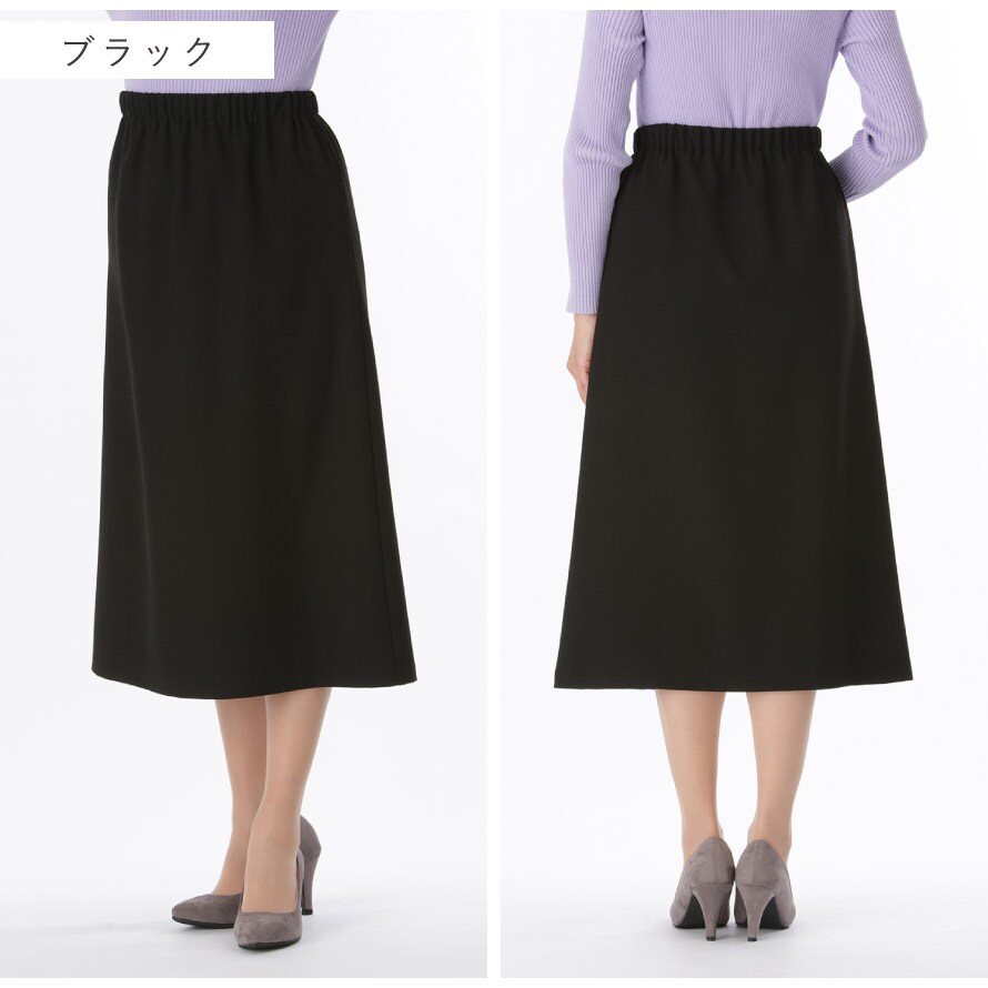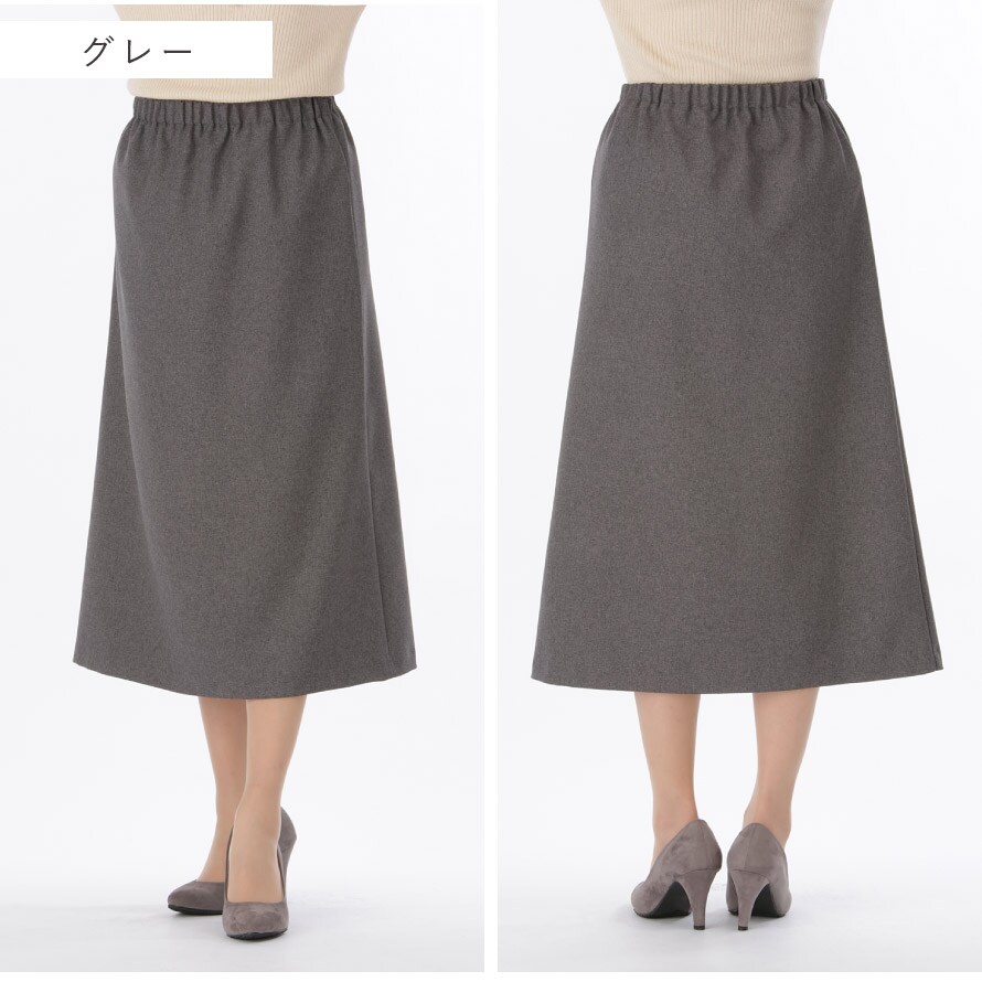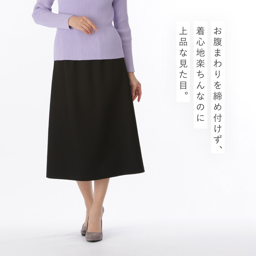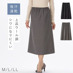 軽やかウール調素材で上品見え。シワになりにくく快適な総ゴムスカート。