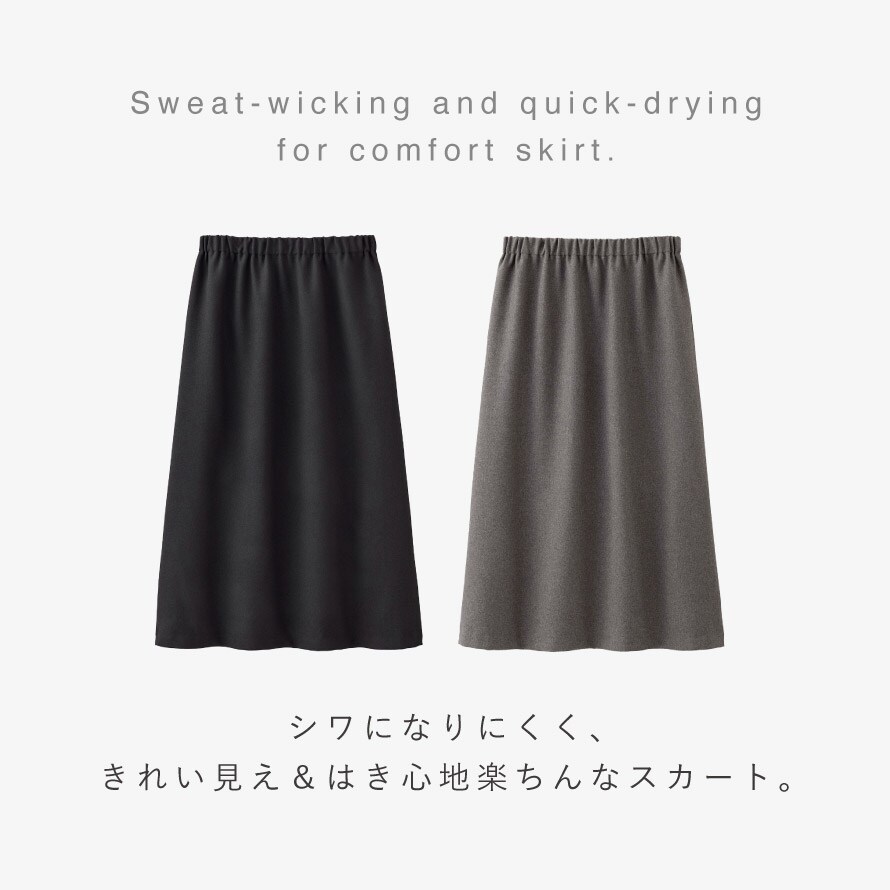 シワになりにくく、すっきり感キープ。吸汗速乾素材で、乾きやすくいつでも快適。旅行や長時間移動にもおすすめのスカートです。