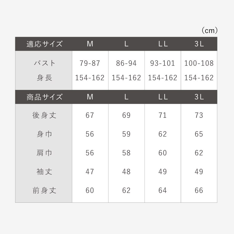 | サイズ | M/バスト79-87、後身丈67、身巾56、肩巾56、袖丈47、前身丈60、L/バスト86-94、後身丈69、身巾59、肩巾58、袖丈48、前身丈62、LL/バスト93-101、後身丈71、身巾62、肩巾60、袖丈49、前身丈64、3L/バスト100-108、後身丈73、身巾65、肩巾62、袖丈49、前身丈66cm |