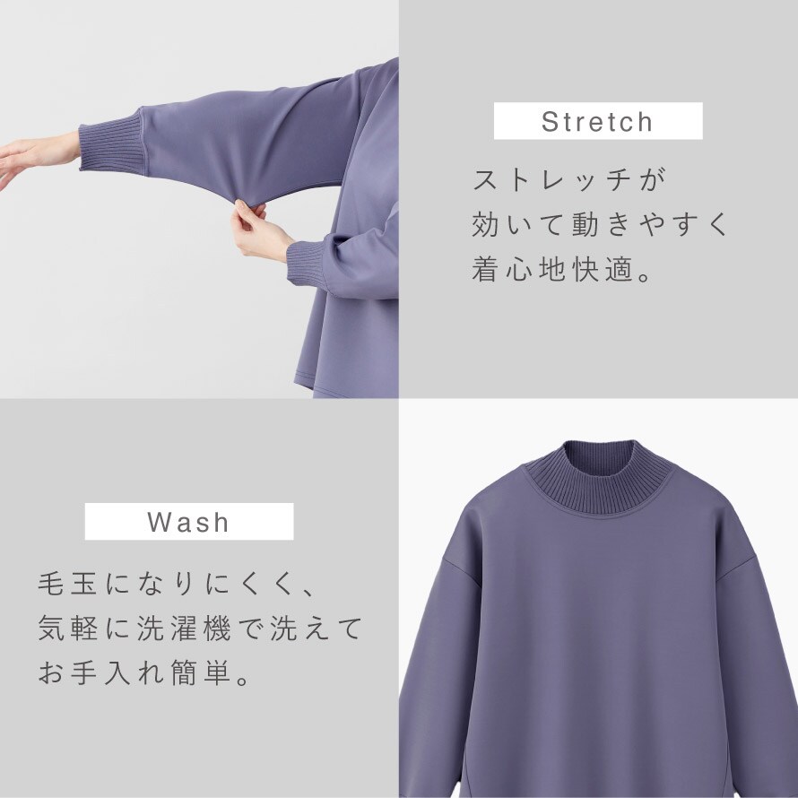 タテヨコストレッチが効いて動きやすく、長時間着てもラクちん。毛玉になりにくく、洗濯機で洗えるお手入れ簡単素材です。