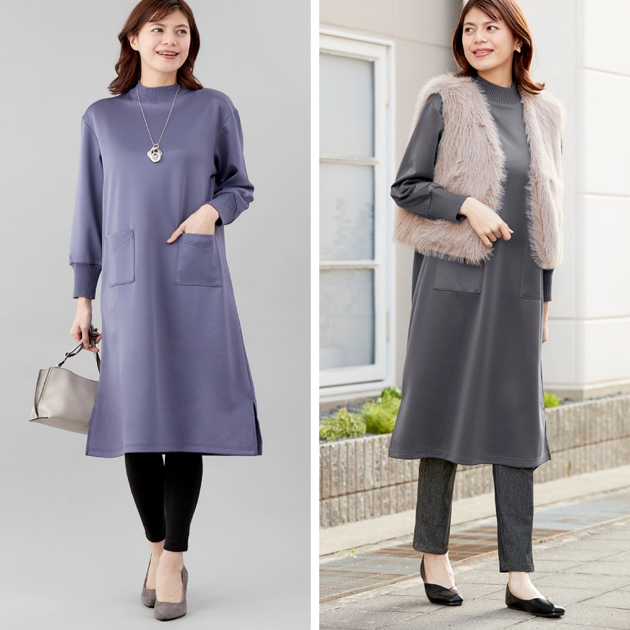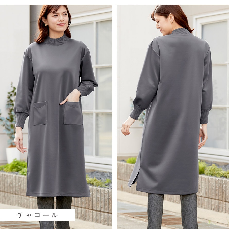 プチハイネックで首元をすっきりカバー。袖口は長めのリブ仕様で袖まくりしやすく、衿と袖のリブがほどよいアクセントに。レギンスやパンツと合わせれば、カジュアルにも上品にもコーディネート自在です。