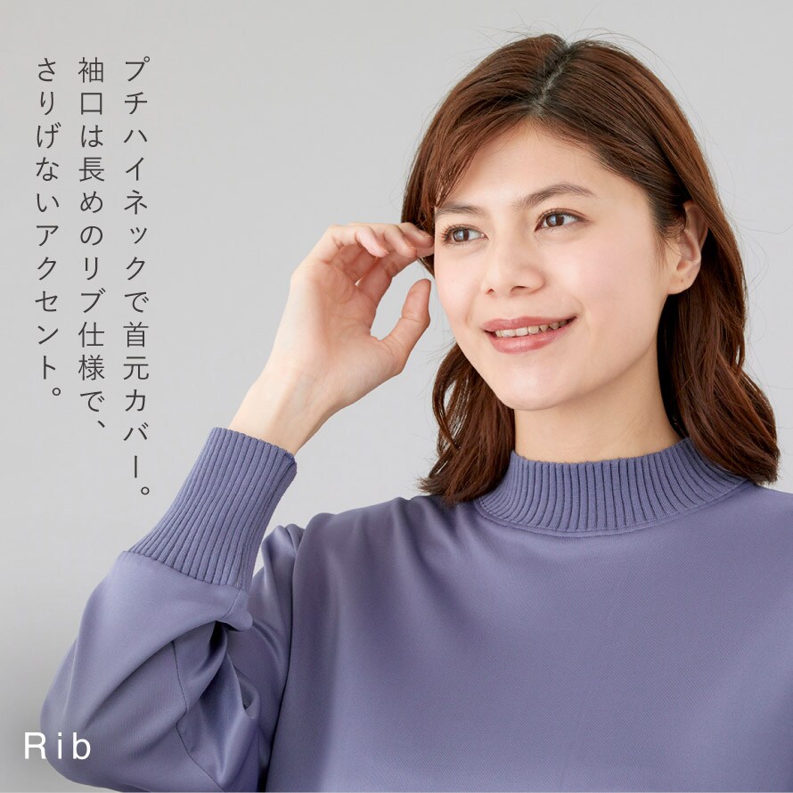プチハイネックで首元をすっきりカバー。袖口は長めのリブ仕様で袖まくりしやすく、衿と袖のリブがほどよいアクセントに。レギンスやパンツと合わせれば、カジュアルにも上品にもコーディネート自在です。