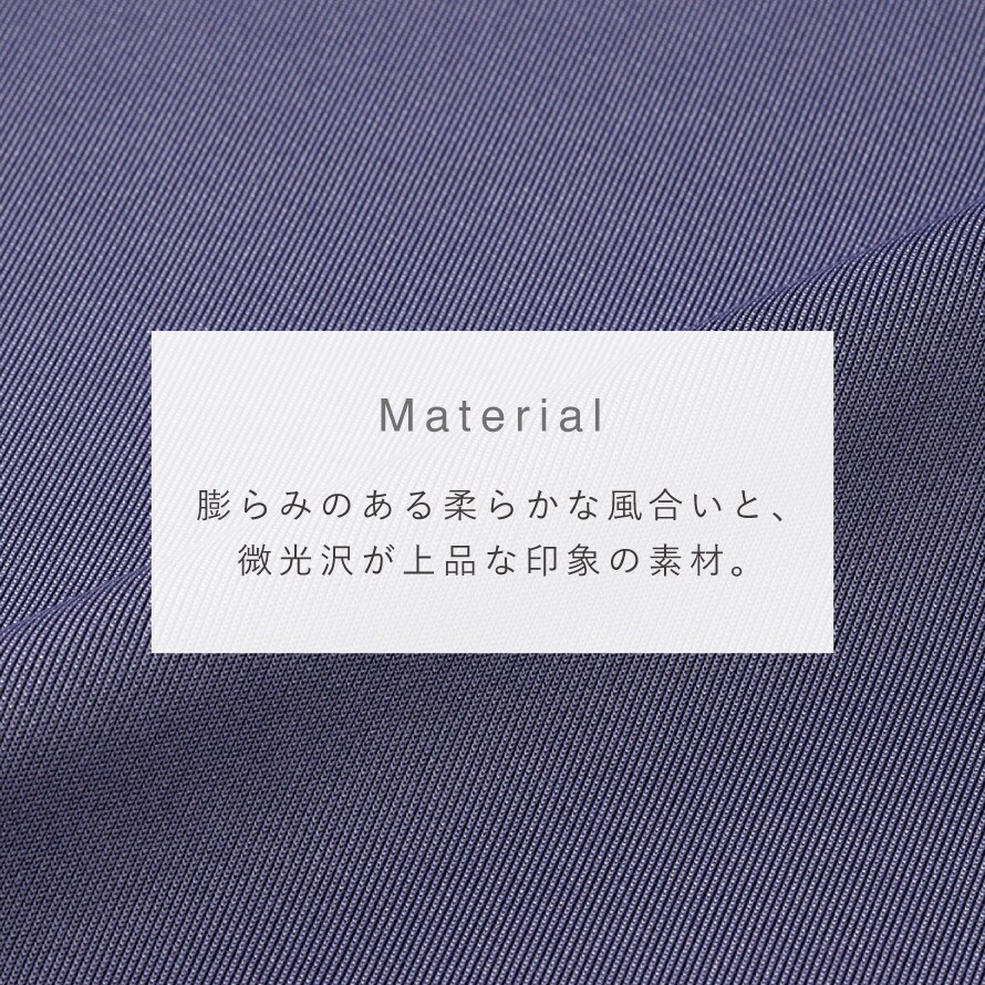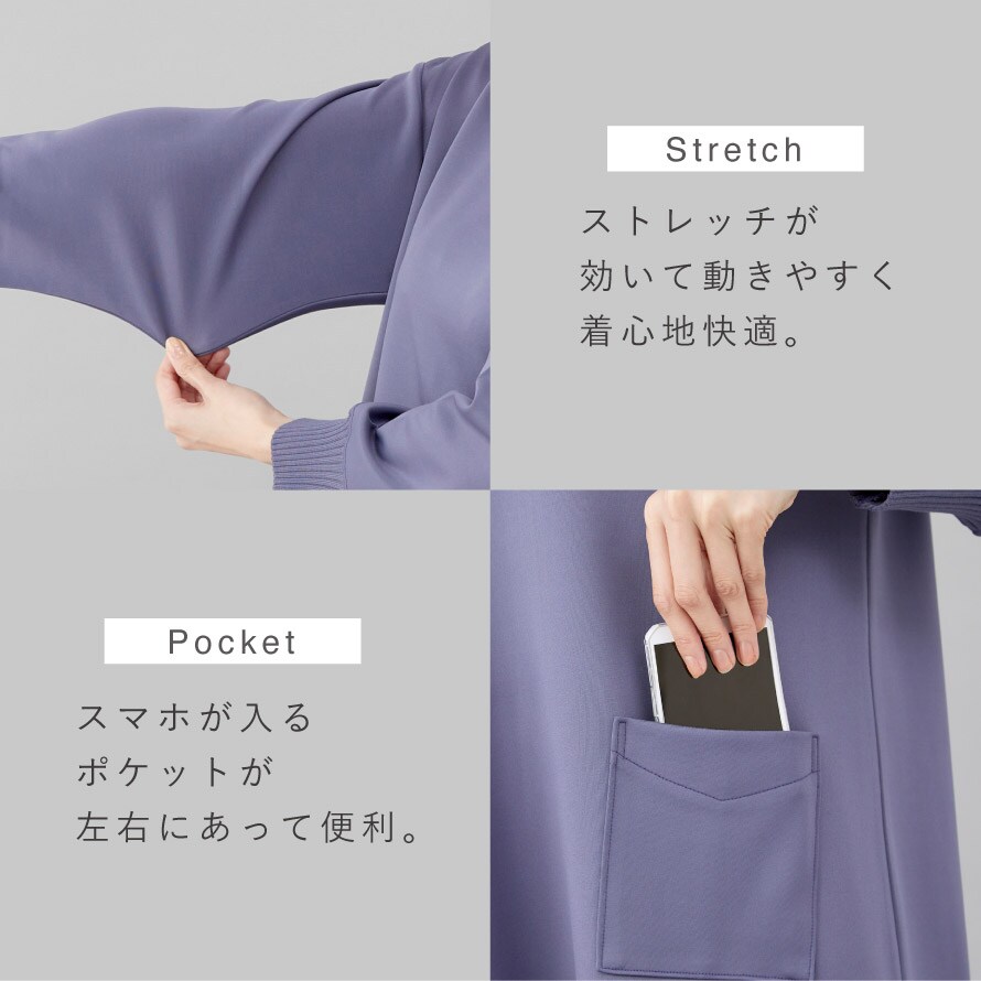 タテヨコにストレッチが効いて動きやすく、長時間着てもラクちん。微光沢のある上品な風合いで、シンプルながらも大人のこなれ感を演出します。