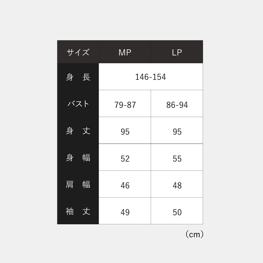 | サイズ | MP/身長146-154、バスト79-87、身丈95、身巾52、肩巾46、袖丈49、LP/身長146-154、バスト88-94、身丈95、身巾55、肩巾48、袖丈50cm |