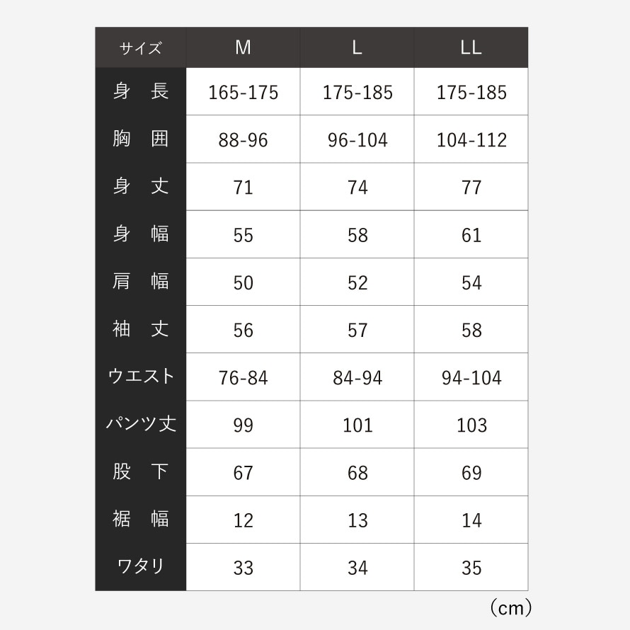 | サイズ | M/身長165-175、胸囲88-96、身丈71、身巾55、肩巾50、袖丈56、ウエスト76-84、パンツ丈99、股下67、裾幅12、ワタリ33、L/身長175-185、胸囲96-104、身丈74、身巾58、肩巾52、袖丈57、ウエスト84-94、パンツ丈101、股下68、裾幅13、ワタリ34、LL/身長175-185、胸囲104-112、身丈77、身巾61、肩巾54、袖丈58、ウエスト94-104、パンツ丈103、股下69、裾幅14、ワタリ35cm |