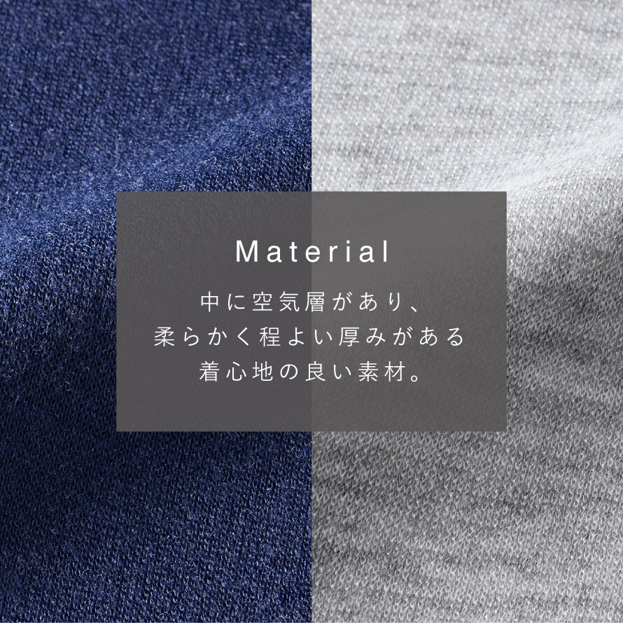 ダンボールのような構造で中に空気層があり、柔らかく程よい厚みがある着心地の良い素材。春秋冬ロングシーズン着ていただけます。