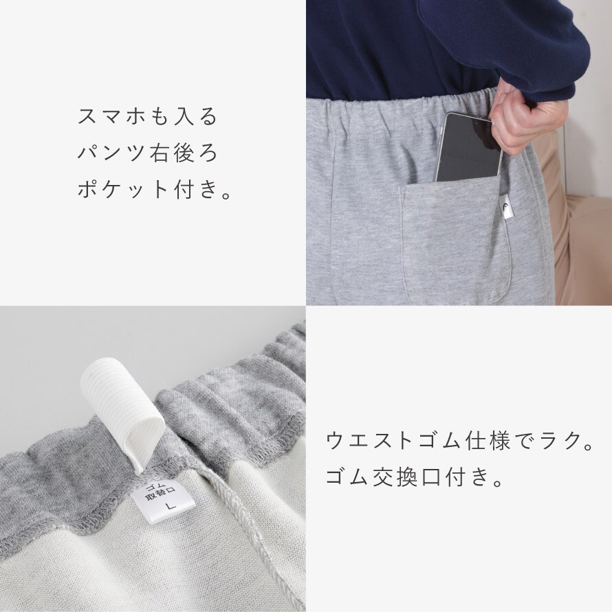パンツ右後ろポケット付きでスマホや小物の持ち歩きにも便利。