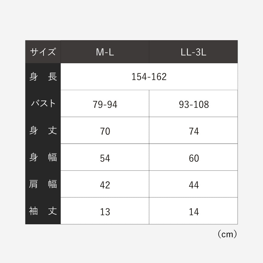 サイズ身長154-162、M-L/バスト79-94、身丈70、身幅54、肩幅42、袖丈13、LL-3L/バスト93-108、身丈74、身幅60、肩幅44、袖丈14cm
