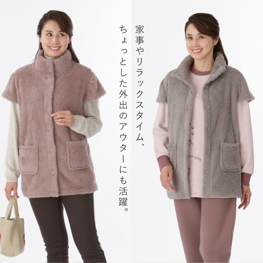 ベスト あったか ボア 冬 パジャマの上 レディース ボア ふんわり 軽い 防寒 羽織り 冬用 もこもこ シニア 女性 フレンチスリーブ ロング丈 暖かい 部屋着 外出 ゆったり 大きいサイズ パジャマ上 M-L LL-3L グレー グレージュ ボアフリースフレンチベスト
