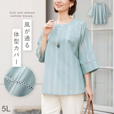 ブラウス レディース 7分袖 M L LL 3L 4L 5L 50代 60代 70代 ミセスファッション シニアファッション 上品 涼しい 春 夏 秋 ゆったり 体型カバー かぶりやすい ストライプ レース 大きいサイズ 袖レース付きゆったりブラウス