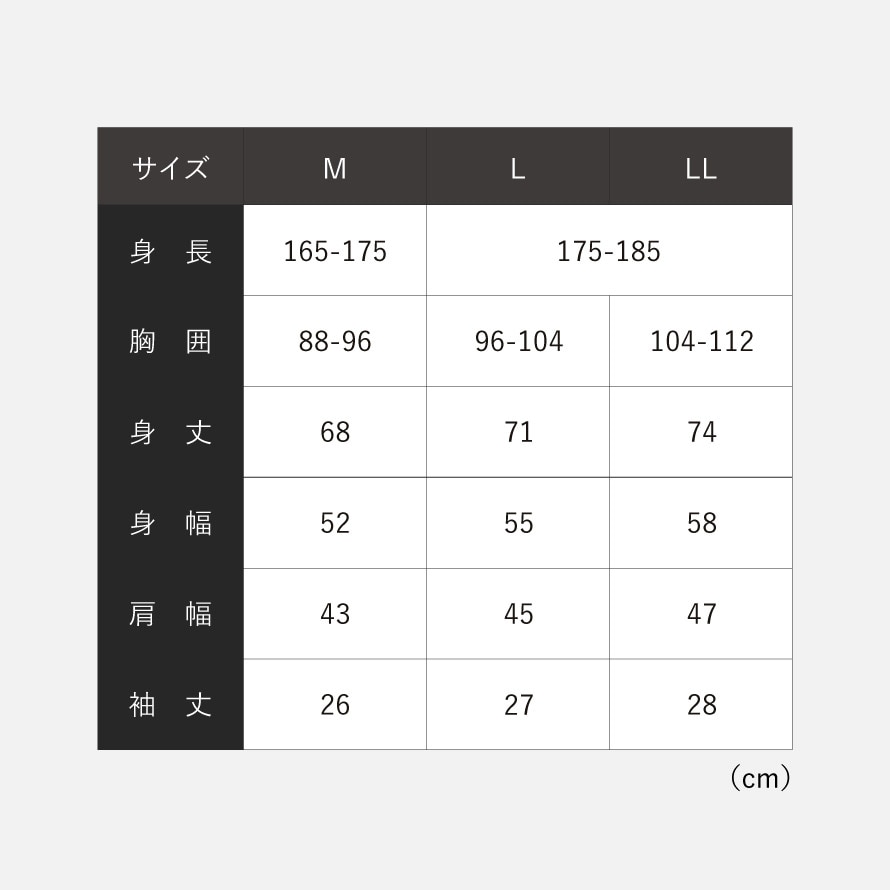 サイズM/身長165-175、胸囲88-96、身丈68、身幅52、肩幅43、袖丈26、L/身長175-185、胸囲96-104、身丈71、身幅55、肩幅45、袖丈27、LL/身長175-185、胸囲104-112、身丈74、身幅58、肩幅47、袖丈28cm